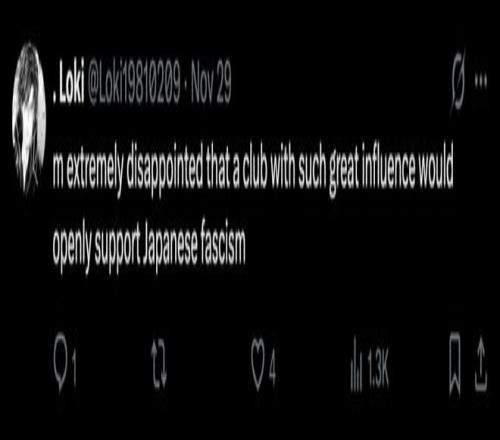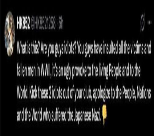 “你们侮辱了二战中所有受害者和阵亡将士,这是对活着的人们以及整个世界的严重冒犯,是对那些遭受过日本纳粹暴行的人民、国家和世界的公然挑衅。把这两个傻瓜赶出你们的俱乐部,向那些遭受过日本纳粹暴行的人们、国家和世界道歉。”