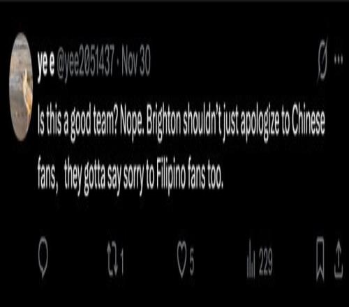 “这是一支优秀的足球队吗?不。布莱顿队不仅应该向中国球迷道歉,还必须向菲律宾球迷道歉。”