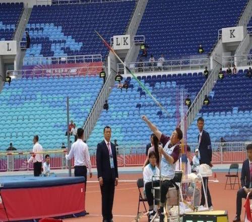 李云鹏/摄(下同)本报(chinatimes.net.cn)记者胡梦然 广州报道刚在女子标枪F54级别决赛中摘得金牌的杨丽婉驱动着轮椅经过走廊,福建队队员们充满敬意地向她打招呼,送上祝贺。相比起